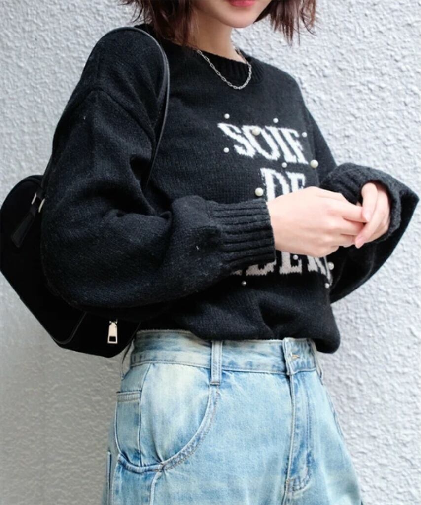 大きめロゴと散りばめたパールがアクセントのジャガードニット。